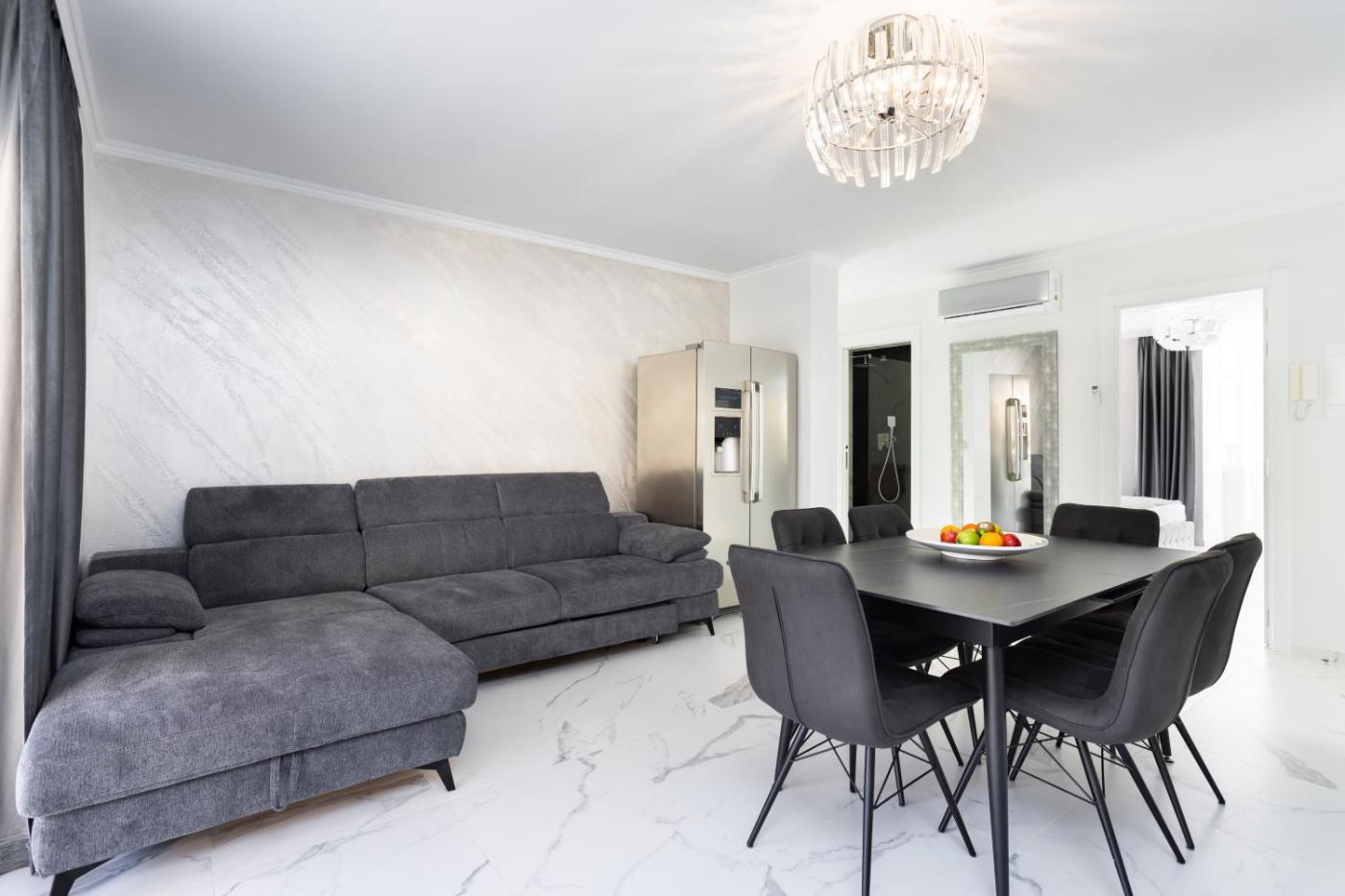 Three-Bedroom Apartment. This apartments special feature is the private pool. This spacious apartment comprises 1 living room, 3 separate bedrooms and 2 bathrooms with a walk-in shower and a bidet. Meals can be prepared in the kitchen, which is equipped with a refrigerator, kitchenware, an oven and a microwave. The air-conditioned apartment provides a flat-screen TV, a washing machine, a tea and coffee maker, a seating area as well as sea views. The unit offers 5 beds.